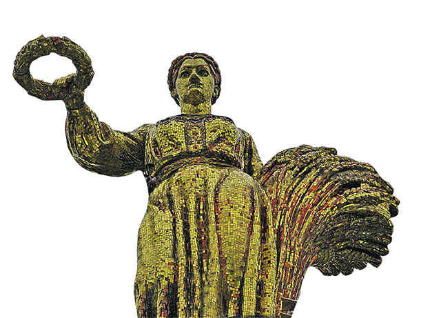 Здание венчает знаменитая скульптура «Мать-Беларусь». На солнце сверкает, как золотая. Она на самом деле облицована позолоченной смальтой.