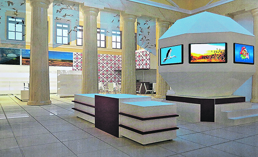 В центре колоннад (верхний снимок) появится в уменьшенном виде знаменитый минский «бриллиант» - стилизованный макет здания Национальной библиотеки Беларуси. На восьми телевизионных экранах будут демонстрироваться тематические программы - о промышленных предприятиях, о людях, о потрясающей природе республики. А в остальной части зала, помимо выставочных площадей, разместится уютный и вполне демократичный по ценнику ресторан (нижний снимок). Блюда национальной кухни будут готовить лучшие повара Беларуси.восемь экранов на гранях «бриллианта»
