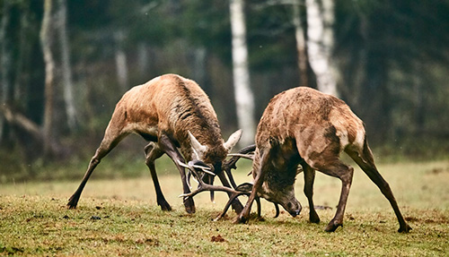 Оленей опасно снимать, когда они дерутся. Тот, который проигрывает, начинает убегать, а второй его догоняет. Убегающий не смотрит, куда он бежит. Если окажешься на тропе, может сбить с ног, да еще рогами добавит.