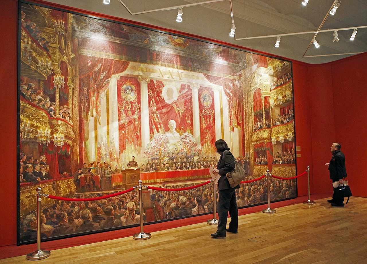 Картина-миф «Гимн Октябрю» - самая огромная на выставке, последний раз москвичи видели ее в 1949 году, на выставке – к 70- летию Сталина. Потом на полвека она исчезла даже из каталогов. Дело в том, что заранее объявленное на 6 ноября 1942 года торжественное заседание по случаю 25-й годовщины Октябрьской революции в Большом театре не состоялось. А на холсте по требованию вождя было воплощено… Интересно, что в последние годы картина была самым востребованным экспонатом Русского музея, побывала на 10 зарубежных выставках - от Финляндии до Бразилии.