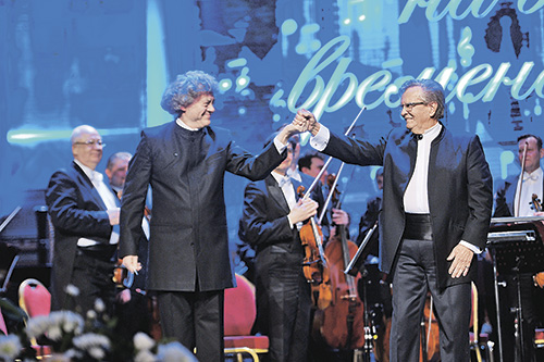 Звезда  звездою говорит: на сцене два мэтра - Владимир Федосеев передает дирижерскую палочку Александру Анисимову.