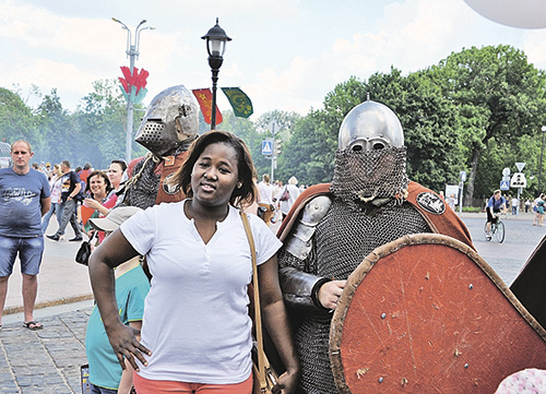 Они встретились над Неманом: студентка из Нигерии и добряк-силач Илья Муромец. Фото: Михаил Фролов/ kpmedia.ru