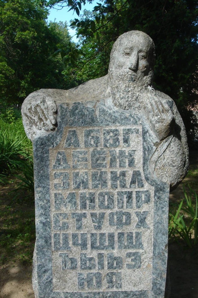 А вот в подмосковном Клину «лингвистическому» памятнику, расположенному на территории одного из лучших учебных заведений - гимназии №1 (ул. Ленина, д.18), ничего не угрожает уже много десятилетий. Не очень приметный с улицы, памятник русскому алфавиту выглядит довольно старым, правда, точных сведений о его авторе и дате установки нет. Скорее всего, монумент появился примерно в одно время с самой гимназией, которая скоро отметит 110-летие. Памятник небольшой и очень тематический: каменная мужская фигура с доской, на которой выведены буквы кириллицы. В местном краеведческом музее рассказывают, что скульптура не совсем закончена, но место ей нашлось правильное — там, где молодежь получает знания.