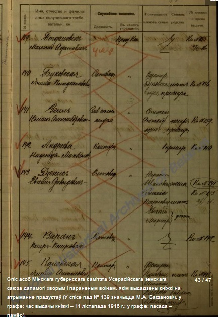Список членов Минского губернского комитета Всероссийского земского союза помощи больным и раненым воинам, которым выданы книжки на получение продуктового пособия. Максим Богданович в списке под номером 139. Дата выдачи книжки 11 ноября 1916. В графе "Должность" - "Умер".