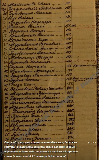 Список людей, которые по постановлению Минского губернского комитета Всероссийского земского союза помощи больным и раненым воинам должны быть лишены продуктовых книжек. Максим Богданович в списке под номером 27).