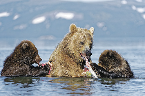 Валерий Малеев. Семейная сцена из жизни камчатских бурых медведей: завтрак на воде.