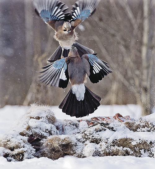 Поединки за еду и самок устраивают не только лоси и олени, но и птицы. Эти две сойки не поделили желудь. Зимой и этот непритязательный корм -