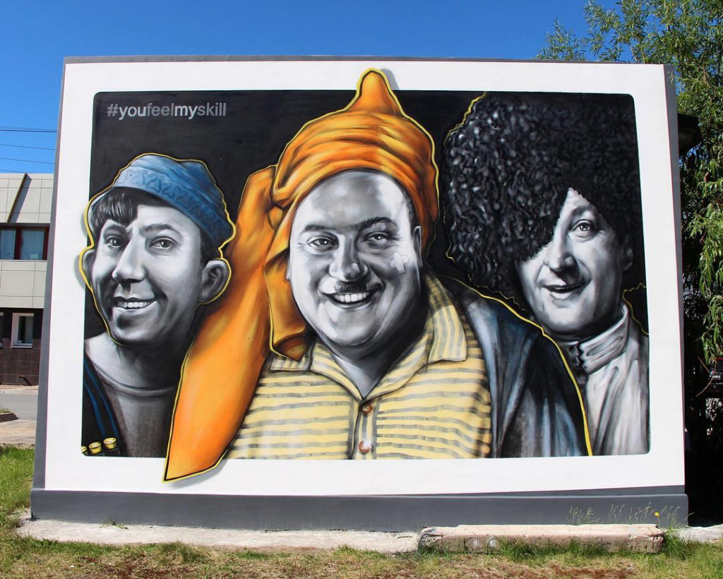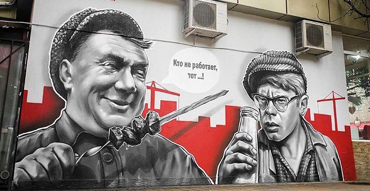 Первая картина появилась на стене одного из зданий в центре Сочи. Это был студент и хулиган Федор из фильма «Операция «Ы» и другие приключения Шурика».