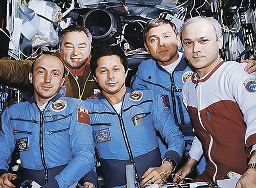 Слева на право: Владимир Васютин, Владимир Джанибеков, Виктор Савиных, Георгий Гречко и Александр Волков на борту станции "Салют-7". Фото: ТАСС
