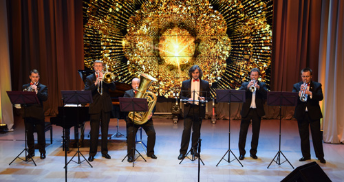 На сцене - ведущие солисты оперы, заслуженные и народные артисты РБ, лауреаты международных конкурсов Илья Сильчуков, Владимир Громов, Анастасия Москвина, Александр Михнюк, Екатерина Головлева и музыканты ансамбля духовых инструментов A.M.A.D.I.S Brass.
