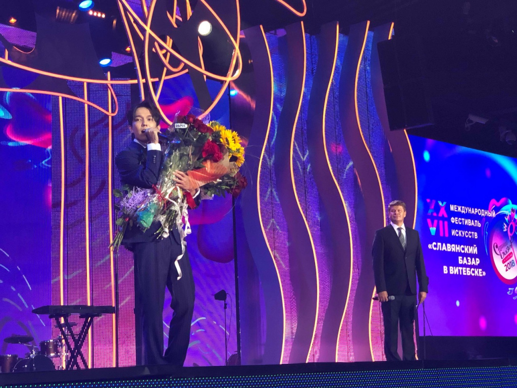 Настоящим украшением музыкального вечера стал молодой певец из Казахстана Димаш Кудайбергенов. Он выиграл Гран-при «Славянского базара» в 2015 году. И именно с этой победы начался его карьерный успех. Сейчас Димаш – настоящая восходящая мегазвезда в Азии – его обожают поклонницы (в Витебске они были самыми яркими и самыми громкими в зрительском зале), задарили его цветами так, что Басков позавидовал бы. Он исполнил песню SOS на французском языке, показав свой невероятный диапазон и магию голоса – от база до фальцета.