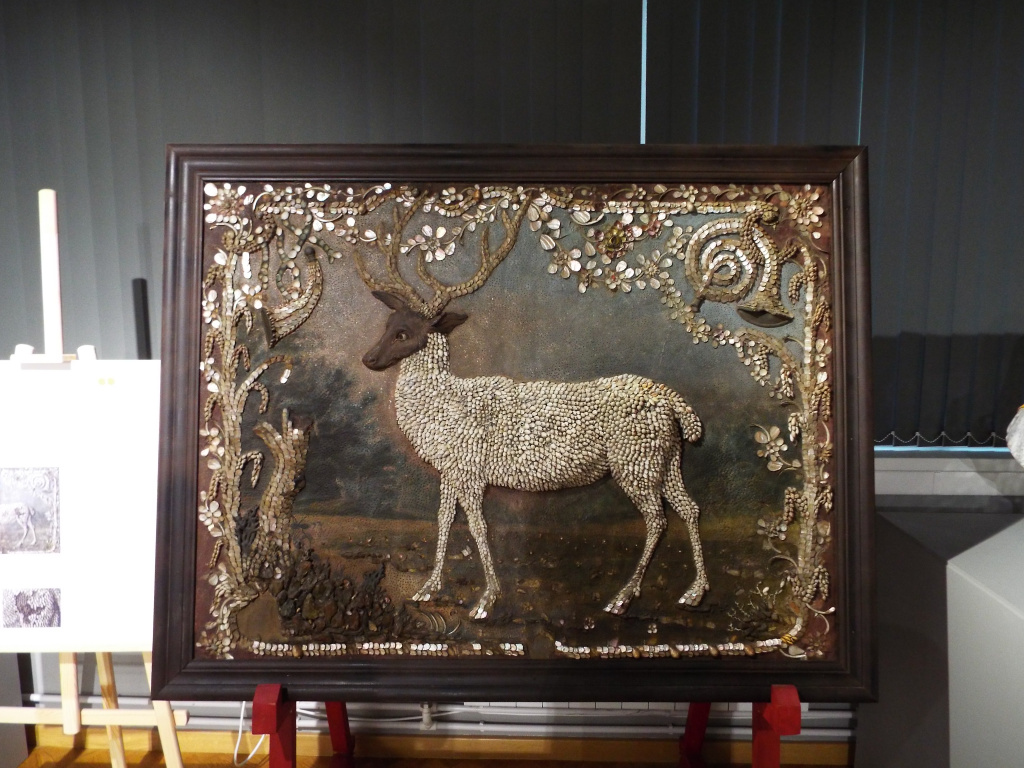 - Панно выполнено в уникальной технике: на холст наложен слой мастики, выложена фигура оленя, дополненная элементами декора, - рассказывает заведующий отделом деревянной полихромной скульптуры и нетрадиционных технологий в реставрации Владимир Симонов. - К нам оно поступило с крупными кракелюрами, отслоениями от основы и утратами перламутра. Были утраты и на фигуре самого оленя: на месте выпавших ракушек зияли «дыры». Но все же общий рисунок сохранялся и можно было представить композицию. Пришлось укрепить красочный слой, грунт, мастику, почти все элементы декора. Чтобы у зрителей создавалось целостное восприятие картины, сделали вставки на фигуре оленя: они не слишком бросаются в глаза, но отличить их от оригинальных раковин можно.