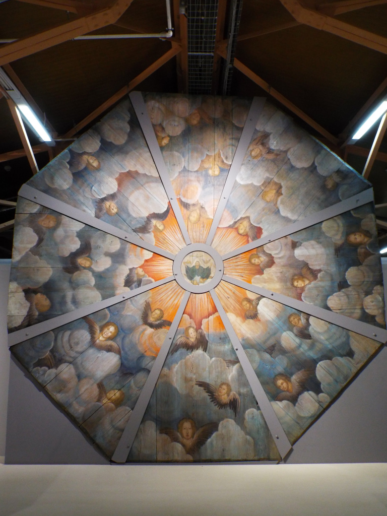 Чтобы увидеть «небо», нужно подняться на верхний этаж выставочного зала – там оно занимает центральное место. Плывущие облака, загадочно улыбающиеся ангелы, словно сошедшие с полотен итальянских мастеров – Кенозерское деревянное чудо поражает почти мистической красотой.