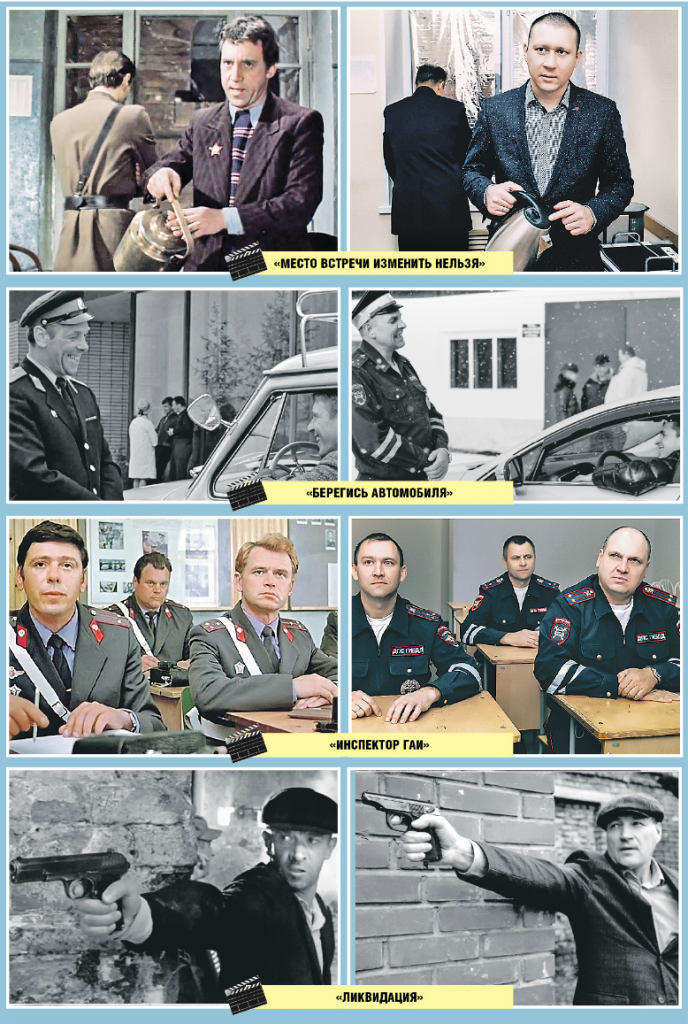 Вот перенесенный в наше время Жеглов наливает кипяток из электрического, а не из меднобокого чайника послевоенных лет, Шарапов сидит возле импортного холодильника или звонит по современному телефону. На другом фото автоинспектор тормозит честного угонщика Юрия Деточкина, сидящего за рулем.