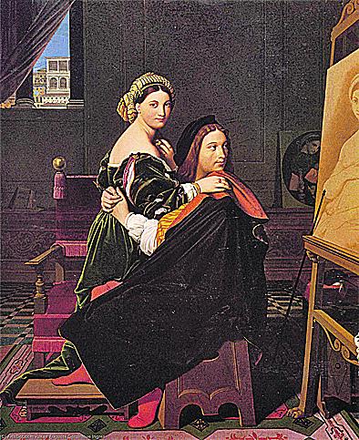 Такую же композицию использовал и французский живописец для создания портрета художника эпохи Возрождения и его спутницы жизни. Работал он кропотливо: за основу взял автопортрет Рафаэля, а вид из окна напоминает о произведениях другого великого итальянца - Микеланджело.