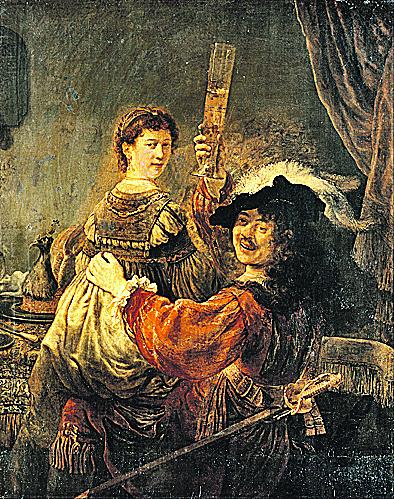 Свою возлюбленную Саскию художник писал часто - в разных образах. На этой картине он изобразил себя вместе с ней: жизнелюб в пышной шляпе с пером держит кубок вина, подруга сидит у него на коленях - строгое лицо обращено к зрителю, но кажется, что она вот-вот рассмеется.