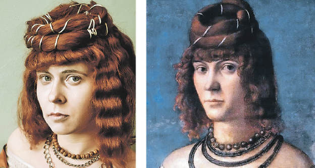 Оксане Солоповой приглянулся портрет куртизанки Витторе Карпаччо. Для репродукции ей понадобились сестра Дарья и четыре часа на грим. И вдруг современная девушка перенеслась в эпоху раннего Возрождения. Сходство идеальное!