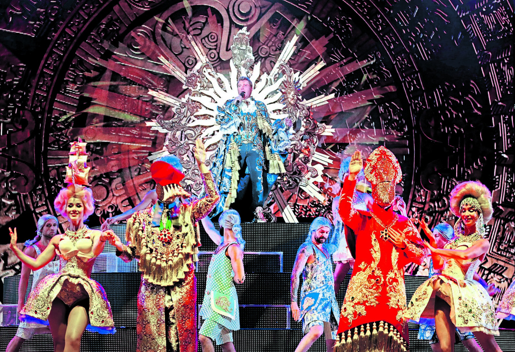 На протяжении всего шоу Басков менял костюмы и маски. Был то королем-солнцем Людовиком XIV на троне, то римским императором Цезарем на колеснице, то парил, как Мистер Икс, над сценой на цирковых качелях без страховки. Менялись и декорации - в Витебск их везли на пяти фурах!