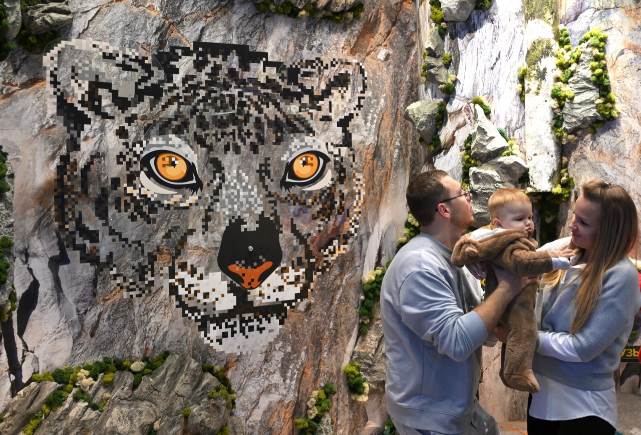 Снежный барс на площадке Алтая внимательно наблюдает за посетителями.