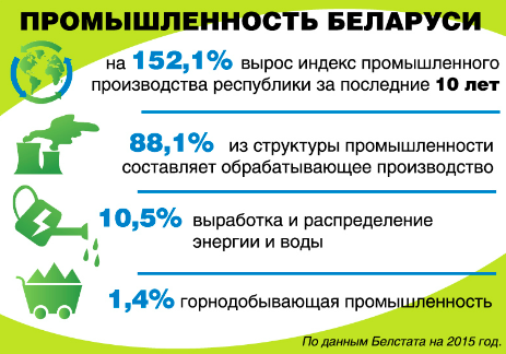 - В Беларуси развитие промышленности, как и других ведущих отраслей экономики, с середины 1990 годов было предметом государственного внимания и регулирования, хоть иногда и чрезмерного. Принимались соответствующие документы, включая упомянутые программы, строго контролировалось их выполнение. В промышленности, безусловно, доминирует государственная собственность. Приватизация проводится относительно
