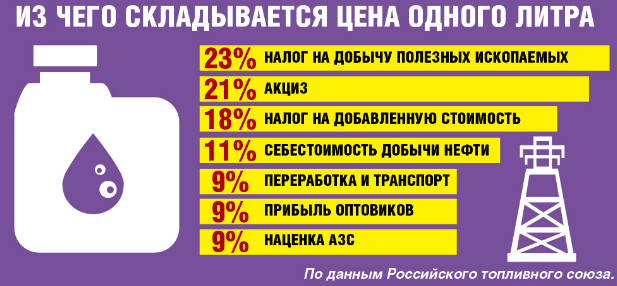 Еще один фактор - налоговая и акцизная нагрузка на нефтяные компании. В пользу государства отдается более 60 процентов тех денег, что мы, как автолюбители, платим на АЗС.