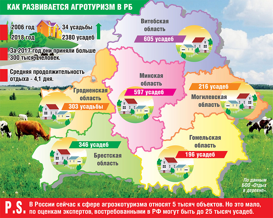 - В Беларуси агротуризм развивается с 2003 года под эгидой общественного объединения «Отдых в деревне». Сейчас у нас почти 2,5 тысячи действующих агроусадеб, - говорит Ольга Пашкевич, заведующая сектором рынка труда Института системных исследований в АПК Национальной академии наук Беларуси.