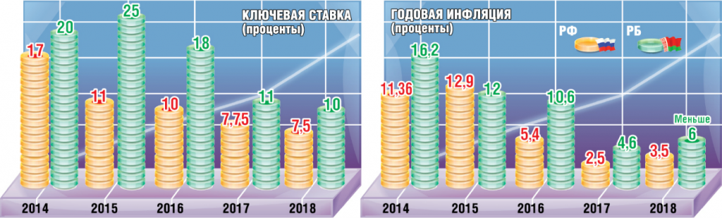 Как бы подтверждая эти заявления, председатель правления Национального банка Беларуси Павел Каллаур сообщил, что по результатам года инфляция в РБ не должна превысить пяти процентов. Так что в 2019 году Нацбанк не исключает и снижения ставки рефинансирования до уровня меньше нынешних десяти процентов.