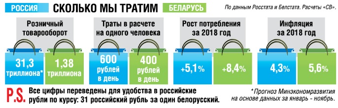 Оборот розничной торговли в России в 2018 году составил примерно 31,3 триллиона рублей. Это пока прикидки Минэкономразвития РФ. Окончательные расчеты скоро сделают в Росстате. В Беларуси итоги уже подвели. Там граждане купили в прошлом году товаров и услуг на 44,7 миллиарда белорусских рублей (это примерно 1,38 триллиона российских). Если взять данные за прошлый год, то окажется, что и в обеих наших странах потребители стали тратить больше - на 5 и 8 процентов соответственно.