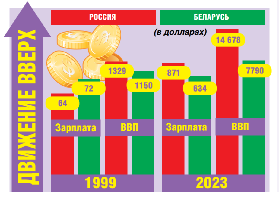 - Среднемесячная зарплата за это время в Беларуси выросла в десять раз, в России - в двенадцать. ВВП в перерасчете на душу населения увеличился практически в семь раз в Беларуси, а в России - в одиннадцать. Товарооборот вырос в семь раз. Цифры говорят сами за себя.
