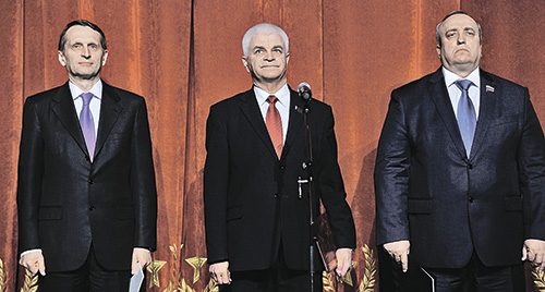 Председатель Парламентского Собрания Союза России и Беларуси Сергей Нарышкин, член Комиссии Парламентского Собрания по бюджету и финансам Виктор Гуминский и член Комиссии по информационной политике ПС Франц Клинцевич открыли торжественный вечер в Театре Российской армии. Фото: Евгения Гусева/ kpmedia.ru