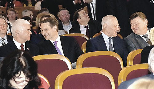 У высоких гостей - члена Комиссии Парламентского Собрания Виктора Гуминского, Председателя Госдумы РФ Сергея Нарышкина, Государственного секретаря Союзного государства Григория Рапоты и Ответственного секретаря Парламентского Собрания Сергея Стрельченко - было приподнятое настроение. Фото: Евгения Гусева/ kpmedia.ru