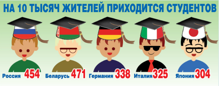 Вроде, все у нас в этой сфере складывается неплохо. Берем количественные показатели: наши сраны остаются в мире одними из самых образованных и студенческих. В Беларуси на 10 тысяч жителей приходится 471 студент, в России – 454. По этому показателю мы далеко обошли такие, казалось бы, передовые страны как Германия (338 студентов), Италия (325) и даже Япония (304).