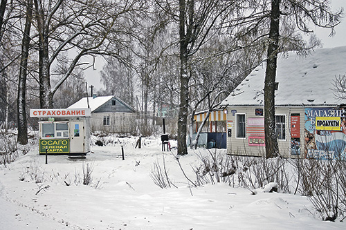 Трасса М1 проходит прямо через деревню Красная горка, и многие с ней связаны. Вот домик, в котором продают страховку. Вот прямо возле автобусной остановки местный продает незамерзайку. Рядом с ним - торговка пирожками и чаем из русского самовара на углях.