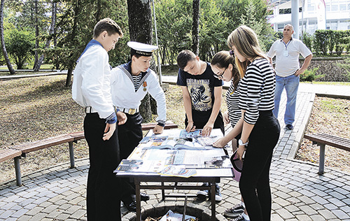 Неподалеку нахимовцы рассказывают о том, что флотская терминология у них во всем: окна не закрывают, а задраивают, кухню называют камбузом, а спальные комнаты кубриками. А еще здесь учат ходить по компасу на веслах и под парусами, вязать морские узлы и знать азбуку флажного семафора.