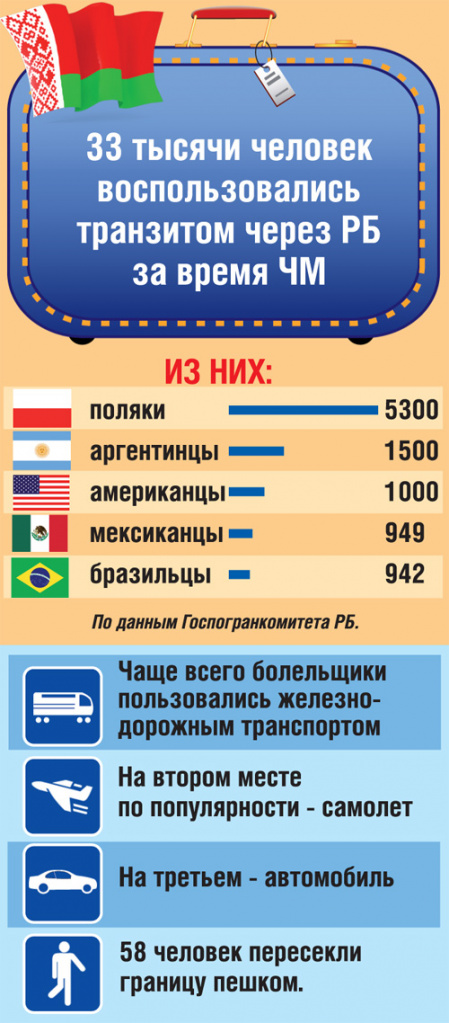 - Увеличилась нагрузка на органы погранслужбы в ходе чемпионата мира по футболу в России, - рассказывал прессе замначальника Управления предварительного расследования и правового обеспечения оперативной деятельности Государственного пограничного комитета Беларуси Алексей Сытенков. - Мы выполняем обязательства по охране границы Союзного государства. Действует процедура прилета и нахождения на территории РФ по паспорту болельщика, но, к сожалению, это позволяет потенциальным мигрантам следовать дальше в страны Европейского союза.