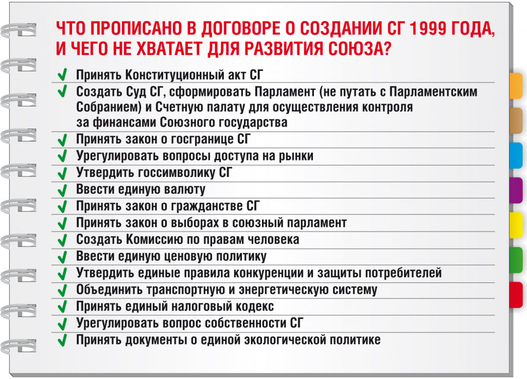 Год назад в Брянске депутаты и эксперты провели парламентские слушания, где обсудили проблемные вопросы в правовом поле нашей интеграции. Там впервые с разных сторон посмотрели на Договор о Союзном государстве, по которому мы живем уже двадцать лет. Документом предусмотрено формирование единого правового пространства в различных сферах. Речь идет об унификации гражданского, налогового, трудового и социального законодательства. Установление идентичных правил поведения на всей территории Союзного государства должно было вывести нашу интеграцию на новый уровень. Однако участники парламентских слушаний пришли к выводу, что Договор реализуется не в полной мере (см. инфографику).