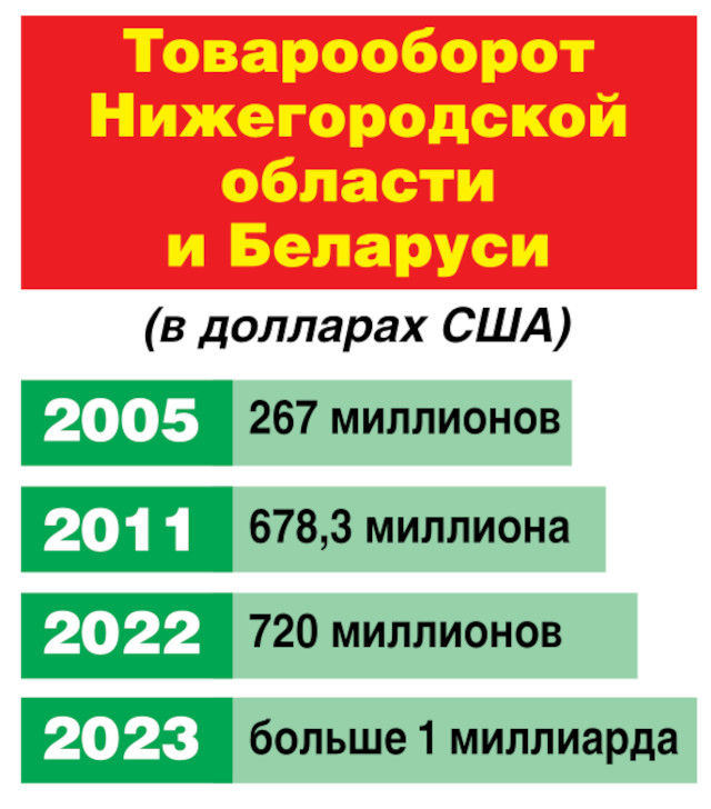 «МиНиН», конечно, символ сотрудничества, но далеко не единственный. По словам министра международных и межрегиональных связей Нижегородской области Ольги Гусевой, больше тысячи местных компаний экспортируют свою продукцию в Беларусь, а шестьсот предприятий заняты импортом из Синеокой: это и автокомпоненты, и медицинские препараты, и сельхозтехника.