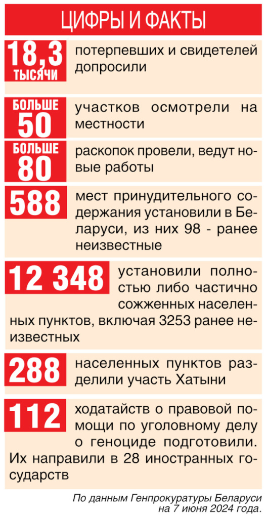Но инициированное Генпрокуратурой расследование вскрывает новые факты массовых убийств. В Беларуси погибло, уничтожено около трех миллионов мирных жителей и военнопленных. В каждой области есть своя Хатынь. Я уже не говорю о лагерях смерти. Примерно 380 тысяч наших соотечественников угнали на принудительные работы. Многие не вернулись, погибли там, многие потеряли здоровье, а возвратившись домой - восстанавливали народное хозяйство.