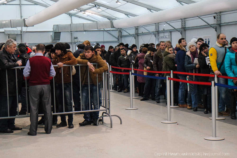 С недавних пор в такой очереди в МФЦ Сахарово, для того, чтобы легализовать своё проживание на территории Москвы, вынуждены стоять и белорусы