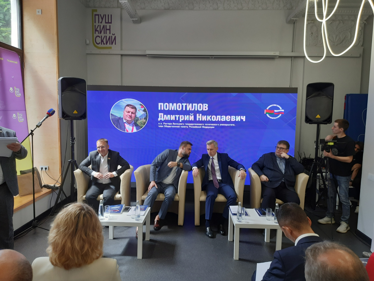 В президиуме семинара (слева направо) – заместитель Председателя Комиссии Парламентского Собрания по молодежной политике, спорту и туризму, член Комиссии ПС по науке и образованию Сергей Клишевич, Председатель Комиссии ПС по молодежной политике, спорту и туризму Артём Туров, Губернатор Смоленской области Василий Анохин и модератор мероприятия, и.о. ректора Липецкого государственного технического университета, член Общественной палаты РФ Дмитрий Помотилов