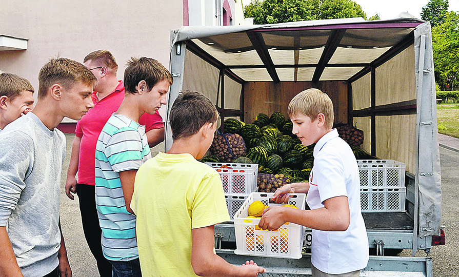 Коля Лукашенко (справа) с товарищами привозит каждый год фрукты и овощи с президентского огорода в дом престарелых. Фото: БЕЛТА