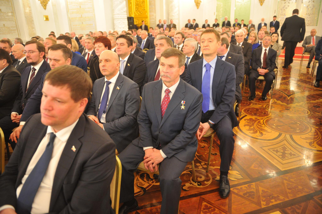 Парламентарии и сенаторы слушают выступление Путина в Георгиевском зале Кремля. Фото: Владимир Веленгурин/kpmedia.ru