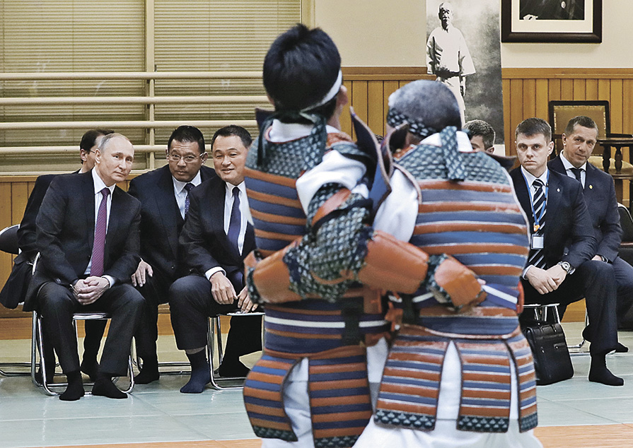 Зная любовь российского лидера к дзюдо, Синдзо Абэ отвез его в Центр восточных единоборств «Кодокан». Тут Путин уже был в 2000 году: тогда надел кимоно, вышел на татами и уложил на лопатки спарринг-партнера. Впечатленные навыками гостя японцы преподнесли президенту пояс шестого дана - символ высокого достижения в дзюдо. В этот раз российский лидер не стал пускать в ход боевые приемы, а просто посмотрел показательные выступления спортсменов.