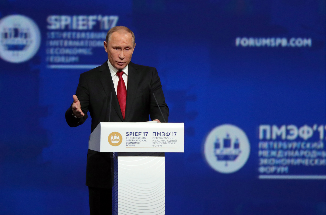 Россия. Санкт-Петербург. 2 июня 2017. Президент РФ Владимир Путин выступает во время пленарного заседания в рамках XXI Петербургского международного экономического форума. Владимир Смирнов / фотохост-агентство ТАСС