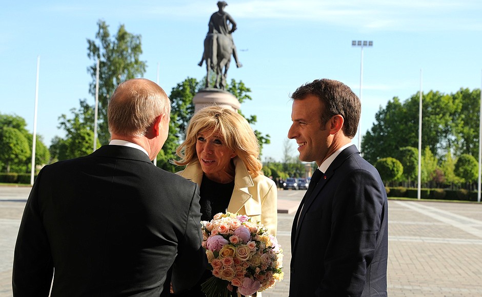 Макрон прибыл с официальным визитом в Россию вместе со своей супругой Бриджит. Путин встретил первую лети Франции с букетом роз. После короткой прогулки и фотосессии президенты стран сели за стол переговоров.