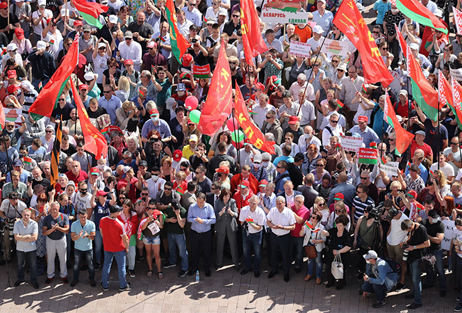Общественная организация «Белая Русь» объявила, что людям, поддержавшим Лукашенко на выборах и обеспечивших ему победу, пора сказать свое слово. В полдень 16 августа на площади Независимости в Минске собрались люди со всей страны. По разным подсчетам – от 65 до 70 тысяч человек держали в руках государственные флаги Беларуси.