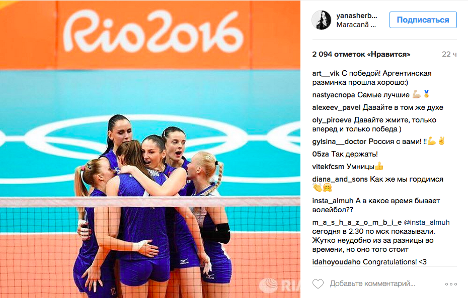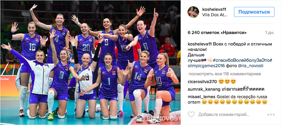 Впечатлениями делятся спортсмены, которые уже успели посоревноваться со сборными других стран. Российская волейболистка Татьяна Кошелева поделилась фотографией сборной, сделанной после победного матча с волейбольной сборной Аргентины (3:0).