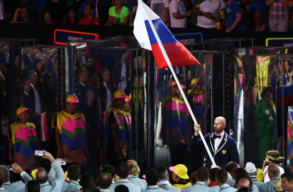 Знаменосец сборной России Сергей Тетюхин (справа) во время парада атлетов на церемонии открытия XXXI летних Олимпийских игр на стадионе "Маракана". Фото: Станислав Красильников/ ТАСС