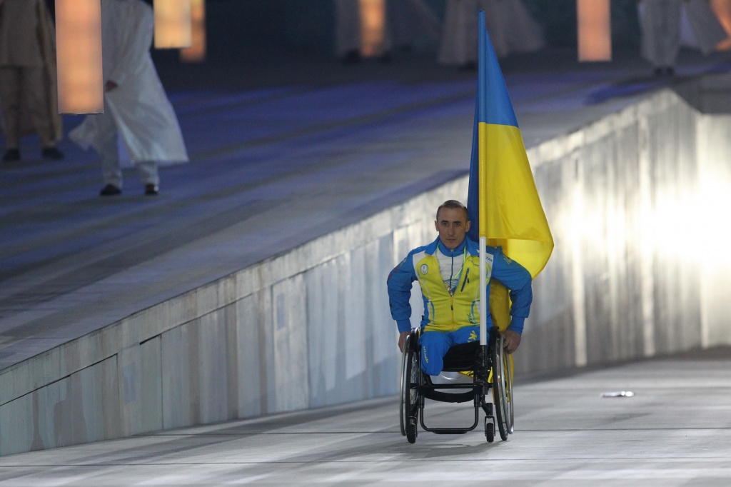 Россия. Сочи. Паралимпиец сборной Украины Михайло Ткаченко во время торжественной церемонии открытия XI зимних Паралимпийских игр на стадионе "Фишт". Фото ИТАР-ТАСС/ Андрей Епихин