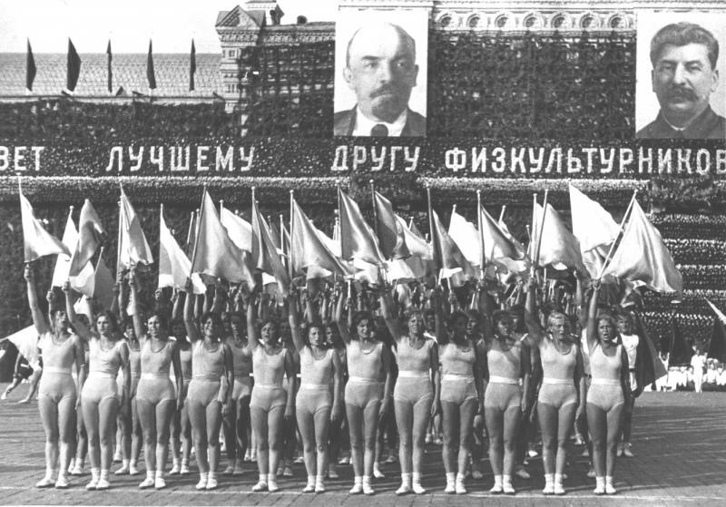 К организации этих действ привлекали профессиональных сценаристов, режиссеров, художников, композиторов. Например, одним из постановщиков программы в тридцатых годах был всемирно известный хореограф Игорь Моисеев. Шествия физкультурников собирали множество зрителей и пользовались популярностью не меньшей, чем парады военные. Люди с удовольствием любовались гимнастическими упражнениями, сложными спортивными пирамидами и тем, как участник театрализованного представления в образе рабочего лупит молотом по цилиндру другого участника, изображающего проклятого западного капиталиста. Сюжет, кстати, по сегодняшним временам вполне актуальный.